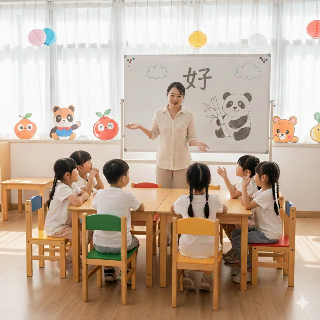 Trẻ làm quen với tiếng Trung thông qua bài hát, hình ảnh, trò chơi, hội thoại ngắn. Không ép viết hay ghi nhớ chữ Hán.